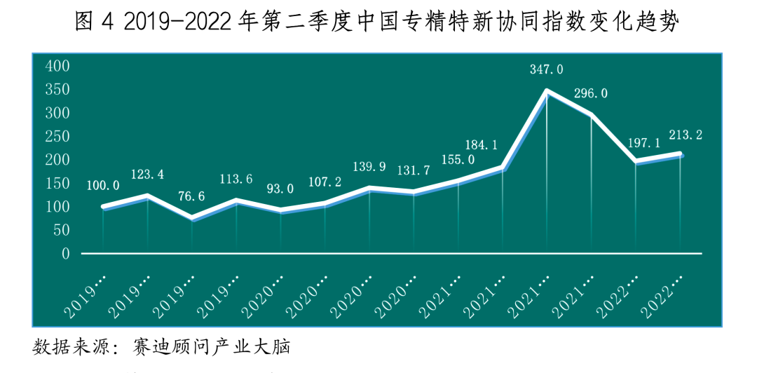2022年第二季度,专精特新企业培育支持政策体系进一步完善,地方配套力度持续加强,二季度中国专精特新协同指数小幅回升至213.2,在经历了“平稳波动、快速冲高、逐步回落”三个阶段后,专精特新协同指数止跌回升。