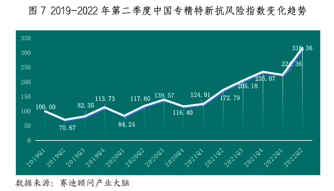 2022年第二季度,中国专精特新抗风险指数上升明显,为316.36,同比增长83.09%,环比增长41.01%。随着我国专精特新企业的招投标数量上升以及法律诉讼件数降低,抗风险指数在2022年Q1略有回落后大幅上升,增速突破历史最佳,专精特新企业内生发展动力明显增强。