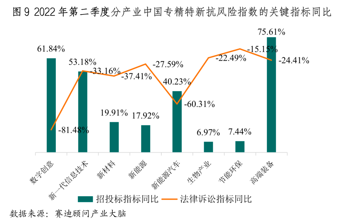 2022年第二季度,从各产业招投标指标同比数据看,高端装备增速最快,为75.61%。数字创意、新一代信息技术、新能源汽车表现较为突出,同比分别为61.84%、53.18%和40.23%。从整体情况看,各产业招投标指标均为上升状况,法律诉讼指标均为下降状况,专精特新整体抗风险能力均有上升。