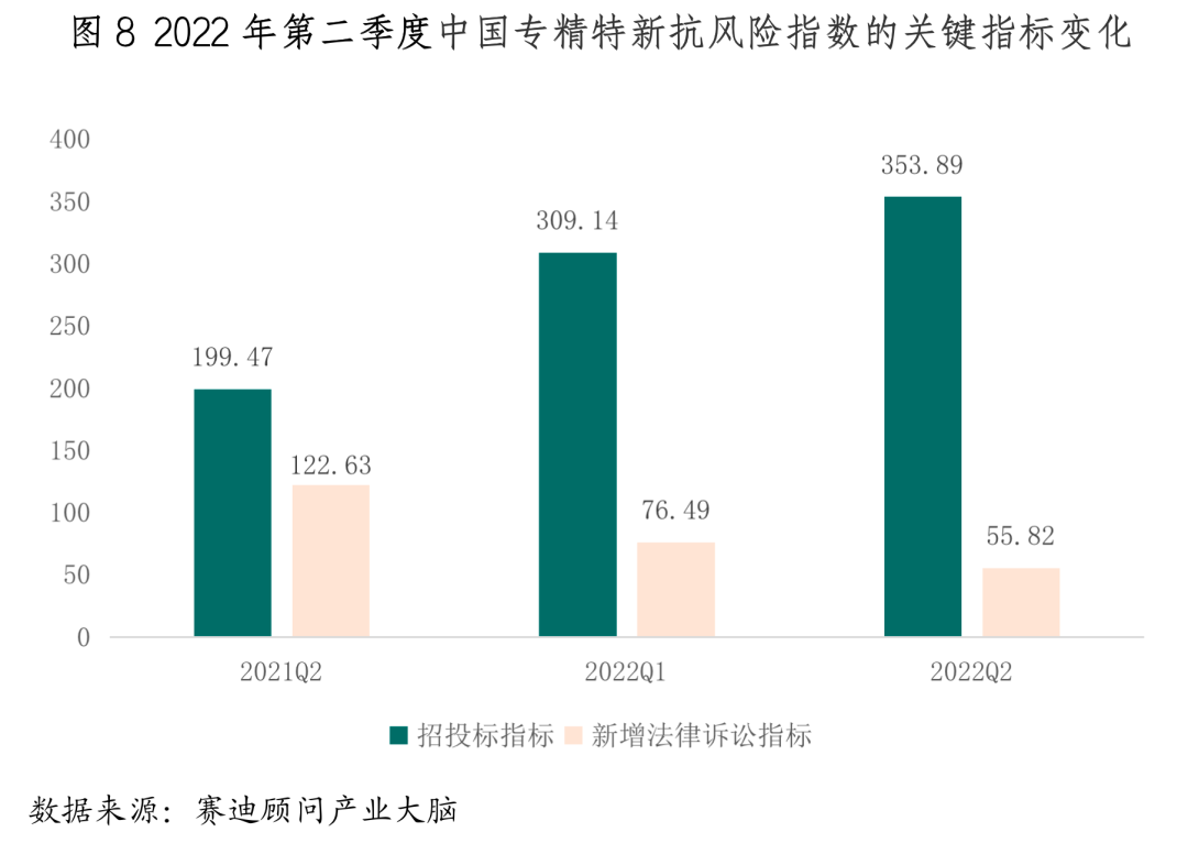 2022年第二季度,我国专精特新招投标指标数据为353.89,较上年同期增长141.04%,环比上升14.48%,受经济环境和疫情影响较小,处于稳定上升阶段。新增法律诉讼指标为55.82,同比下降66.27%,环比下降27.02%,表明企业整体法律意识逐渐增强,法律结构组织逐步完善,法律风险有所降低。