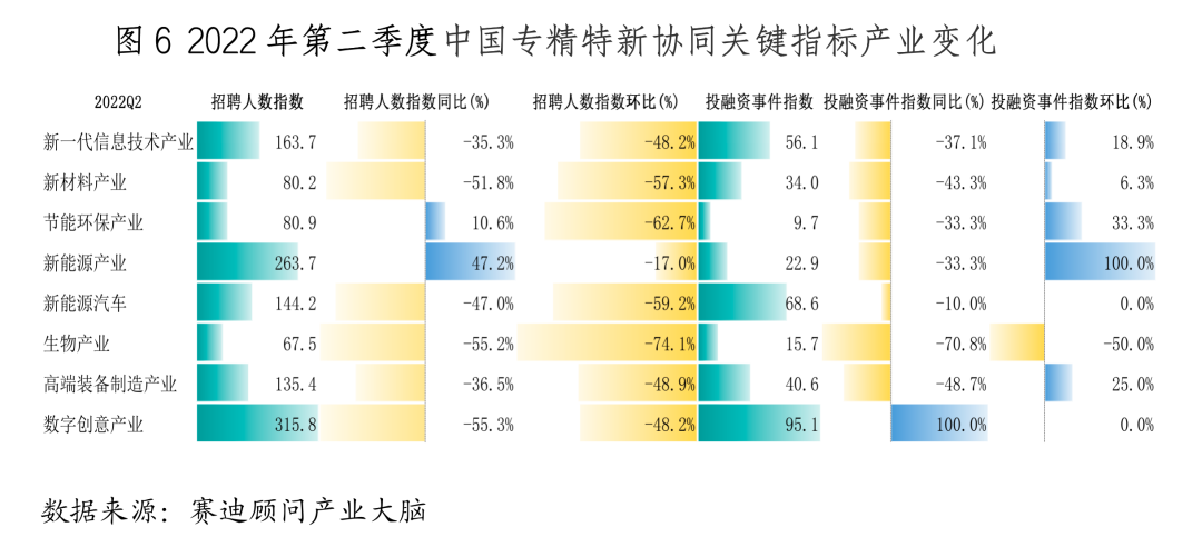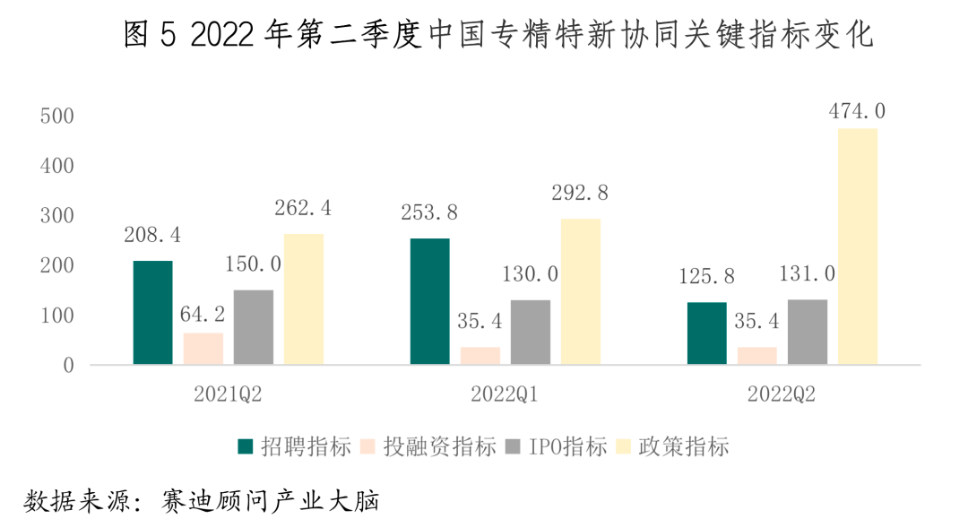 2022年第二季度,受经济环境和疫情冲击的影响,协同指数中的招聘指标环比下降明显,为-50.4%;投资和IPO保持谨慎,投融资指标和IPO指标的环比基本持平,为0.0%和0.8%;本季度为专精特新申报高峰期,各地相关政策密集出台,政策指标环比增长明显,为61.9%。