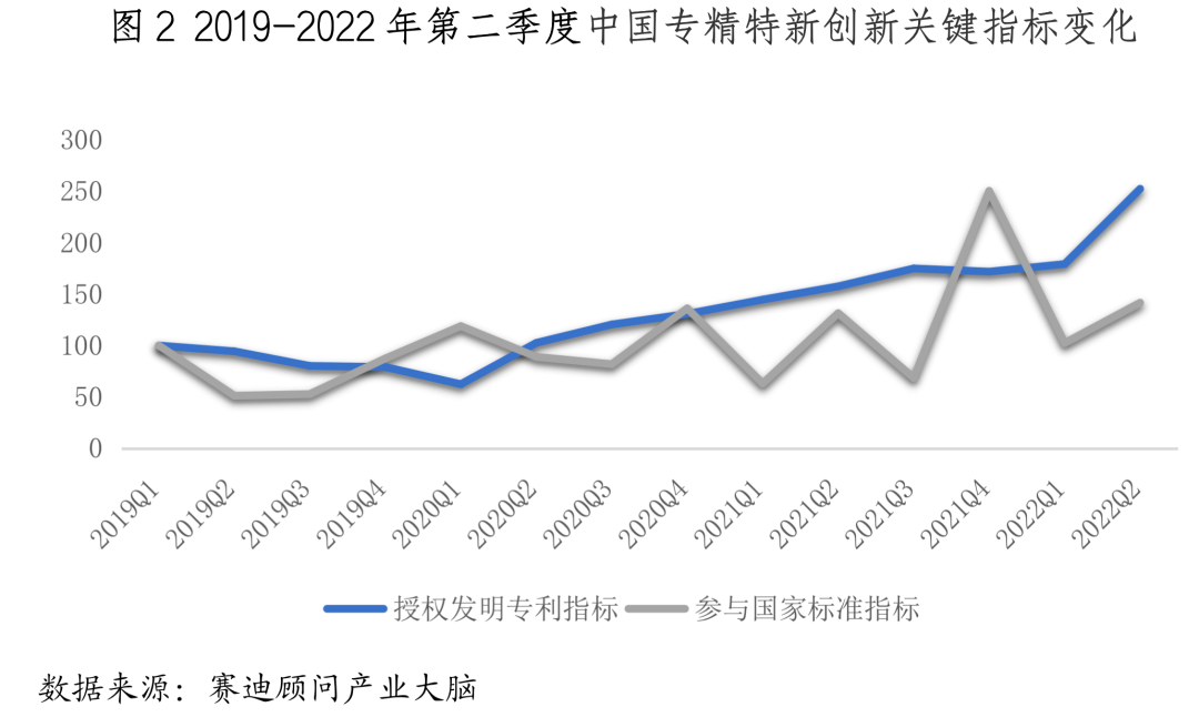 2022年第二季度,我国专精特新授权发明专利指标数据为252.5,较上年同期增长60.2%,较2022年Q1增长40.8%,同比与环比均实现快速增长,专精特新企业创新能力和创新水平实现了进一步提升。同样,从参与国家标准指标数据看,2022年第二季度我国专精特新企业参与国家标准指标数据为141.7,较上年同期增长7.8%,较Q1环比增长38.4%,彰显专精特新企业行业影响力、技术影响力、产品影响力在不断增强。