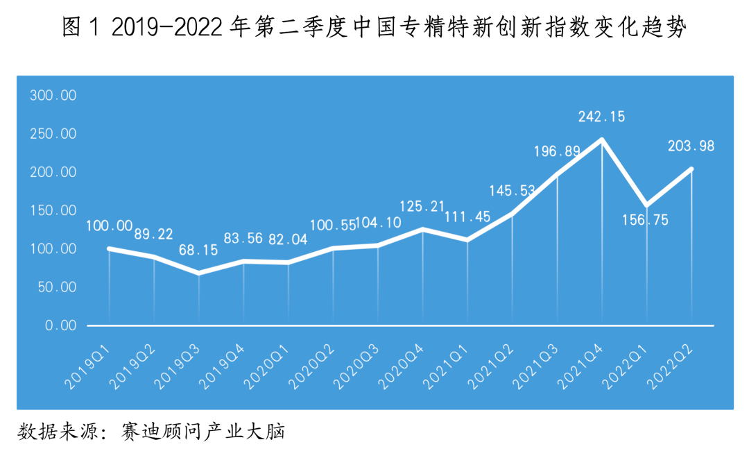 2022年第二季度,我国专精特新创新指数为203.98,呈现较大幅度的回升,同比与环比分别增长40.2%和30.1%。随着稳经济政策加速落地和促进大中小企业融通创新“携手行动”快速实施,企业创新环境不断优化,创新动能加速释放,产出效率明显提升。