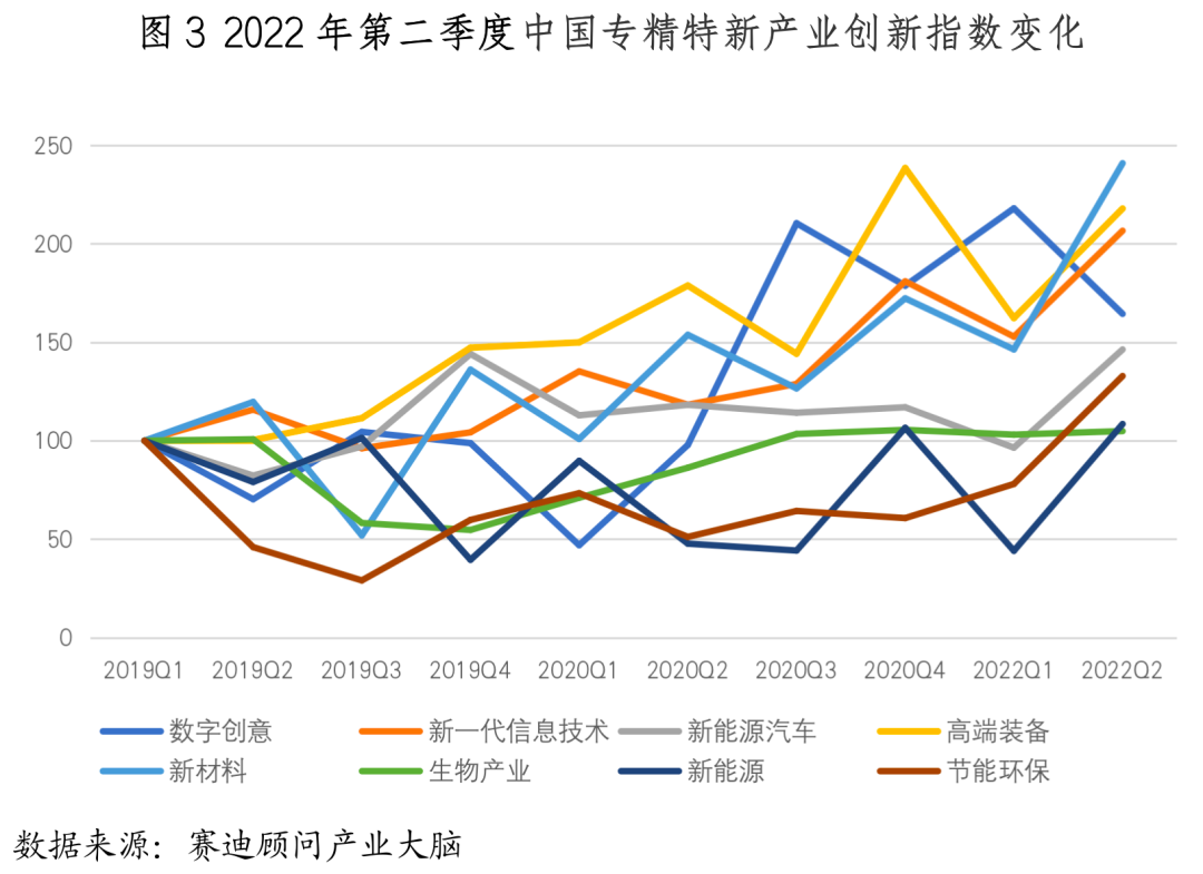 2022年第二季度,从分产业指数看,新材料、高端装备、新一代信息技术企业创新活力最强,创新指数均超过200;从分产业指数增速变化,新能源产业指数增长最快,同比与环比分别增长127.4%和146.2%。随着国家“双碳”战略的全面落实,新能源产业创新动能正在逐步释放。