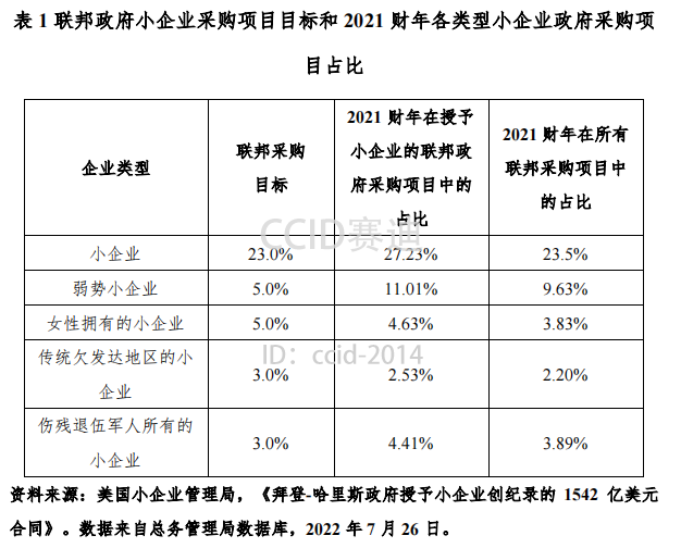 表1所示为2021财年不同类型小企业采购项目占比和联邦政府小企业采购项目目标的对比情况。