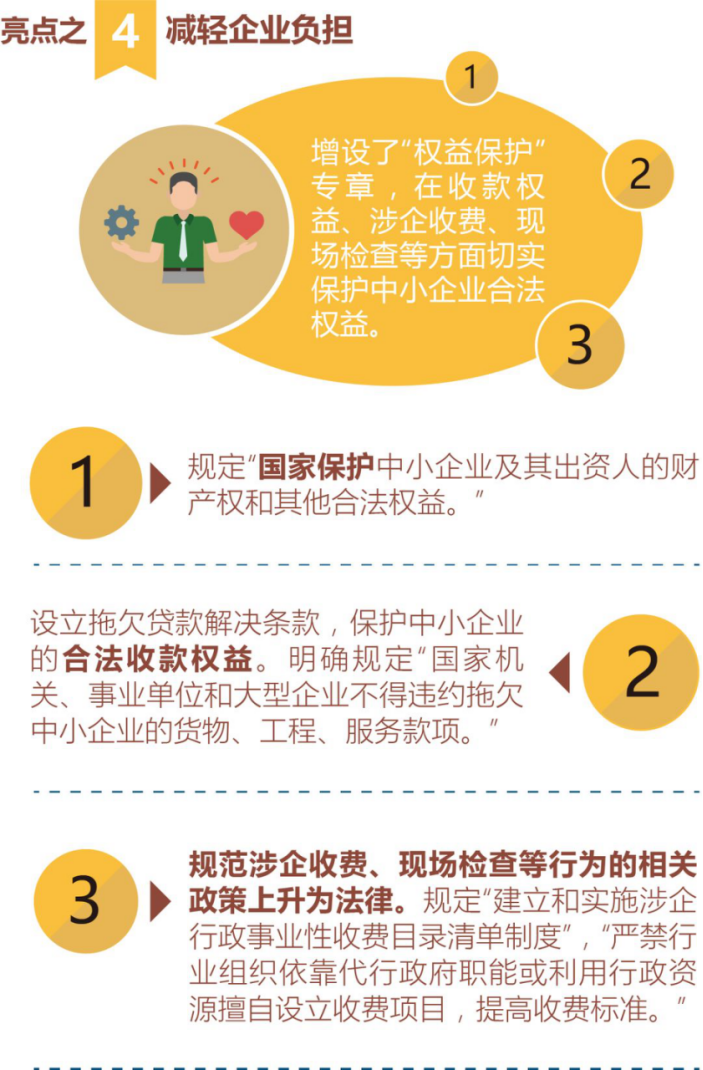 为切实保障中小企业合法权益,2017年新修订的《中小企业促进法》增设“权益保护”专章,其中具体内容涉及多个方面,包括保护企业财产权、建立政企联系渠道、依法开展对企管理、规定按期履约付款、严格规范涉企收费、对企依法监督检查、降低企业迎检次数等,为中小企业合法权益保护建起四梁八柱,形成切实有效的坚厚保护墙。