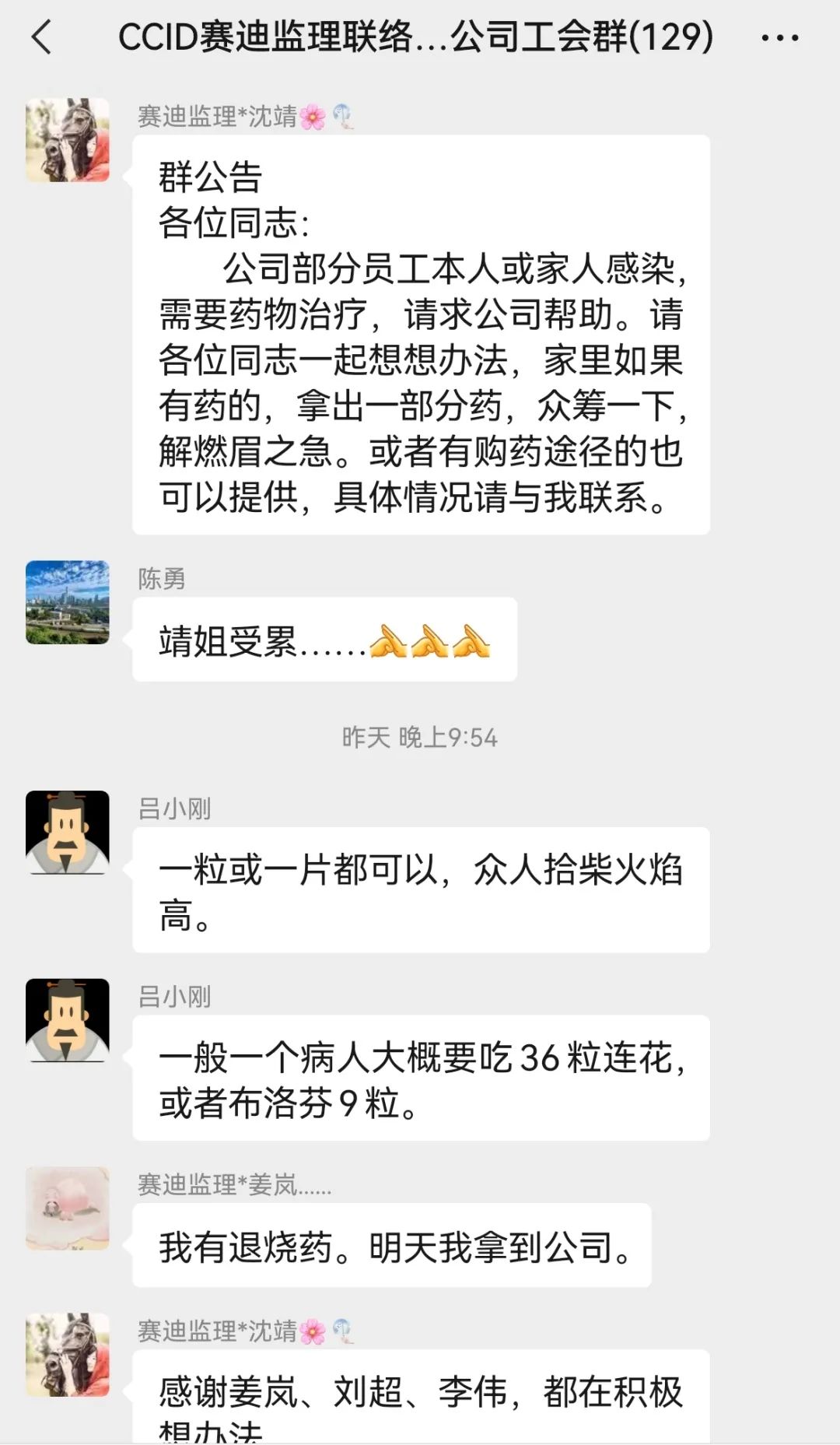 近期,公司了解到几名员工家里有关治疗和检测新冠病毒的药物、抗原检测盒不够,员工心情比较焦急。本着最大努力为员工健康着想和切实解决员工自身存在的困难,12月11日晚,支部书记、总经理吕小刚在“365health_365bet足彩论坛_365bet.com监理党支部”工作群里发出消息“公司部分员工本人或家里人阳了,需要救急的药或抗原检测盒,请求公司帮助”,同时倡议:全体党员同志一起想想办法,家里如果有多余的药品拿出来一部分,众筹一下,以解燃眉之急。