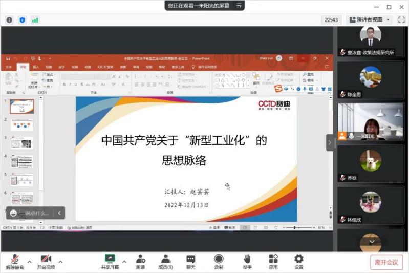 2022年12月13日上午,政策法规研究所召开“新型工业化”主题党日活动,贯彻落实党的二十大精神,分享学习新型工业化的收获、感悟,以及下一步工作计划。乔标副院长出席会议并讲话,政策法规研究所党支部全体党员参加会议。