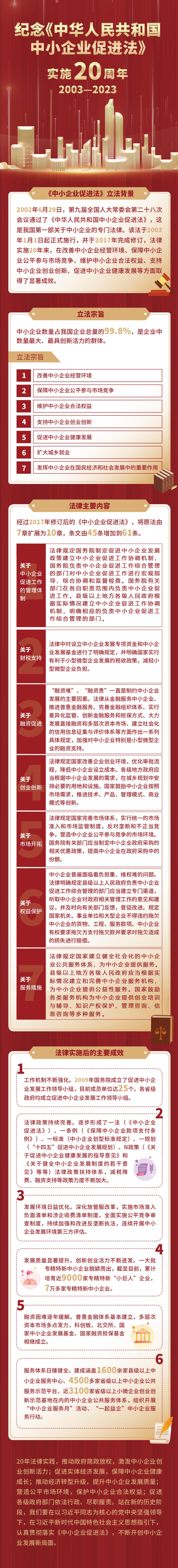 2003年1月1日,《中华人民共和国中小企业促进法》正式实施,并于2017年完成修订,这是我国第一部关于中小企业的专门法律,法律施行20年来,在改善中小企业经营环境、保障中小企业公平参与市场竞争、维护中小企业合法权益、支持中小企业创业创新、促进中小企业健康发展等方面取得了显着成效。为了进一步宣传贯彻《中小企业促进法》,热烈庆祝《中小企业促进法》实施20周年和修订实施5周年,我院开展系列宣传活动。