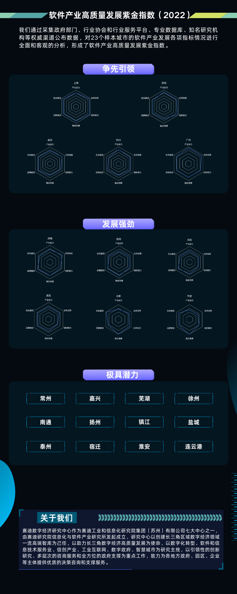 《指数》显示,上海、深圳、南京、杭州、广州等城市软件产业发展优势突出,起到争先引领作用。其中,上海综合发展实力优势显着;深圳在产业实力指标上表现突出,创新投入、资本支持上较为领先;南京在企业集聚、名城名园建设上位居前列。