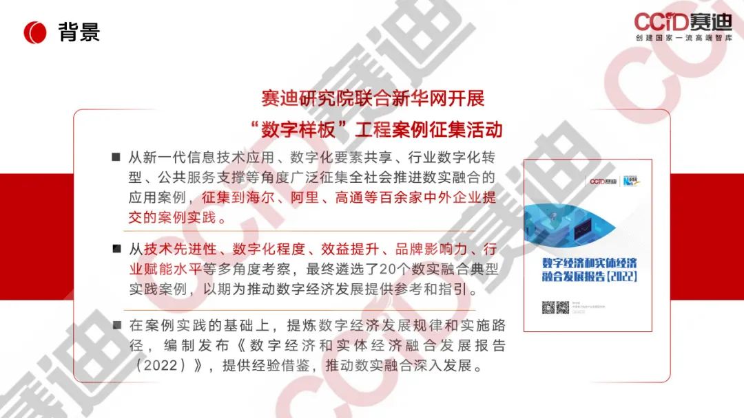为梳理数实融合的发展进展、未来趋势和落地实践,中国电子信息产业发展研究院联合新华网共同开展“数字样板工程”,广泛征集全社会推进数实融合的应用案例,组织优秀实践案例遴选,总结数实融合优秀经验,提炼数字经济发展规律和实施路径,编制形成《数字经济和实体经济融合发展报告(2022)》,并于11月27日在新华通讯社和海南省人民政府主办的2022中国企业家博鳌论坛上发布。旨在为政府、企业、行业组织提供可落地的经验借鉴,切实推动数实融合深入发展。